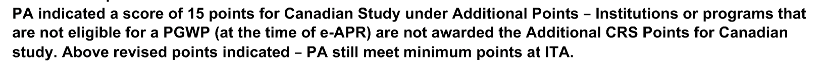PA indicated a score of 15 points for Canadian Study under Additional Points – Institutions or programs that are not eligible for a PGWP (at the time of e-APR) are not awarded the Additional CRS Points for Canadian study. Above revised points indicated – PA still meet minimum points at ITA.