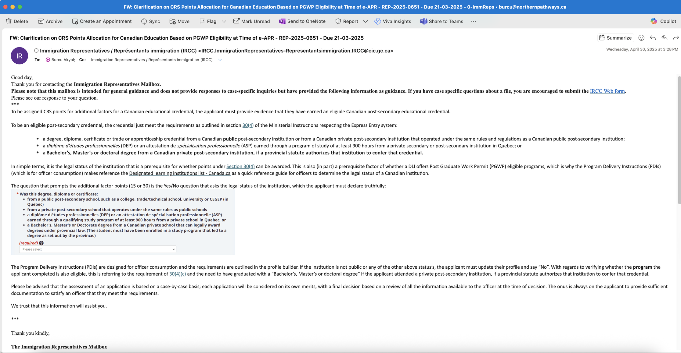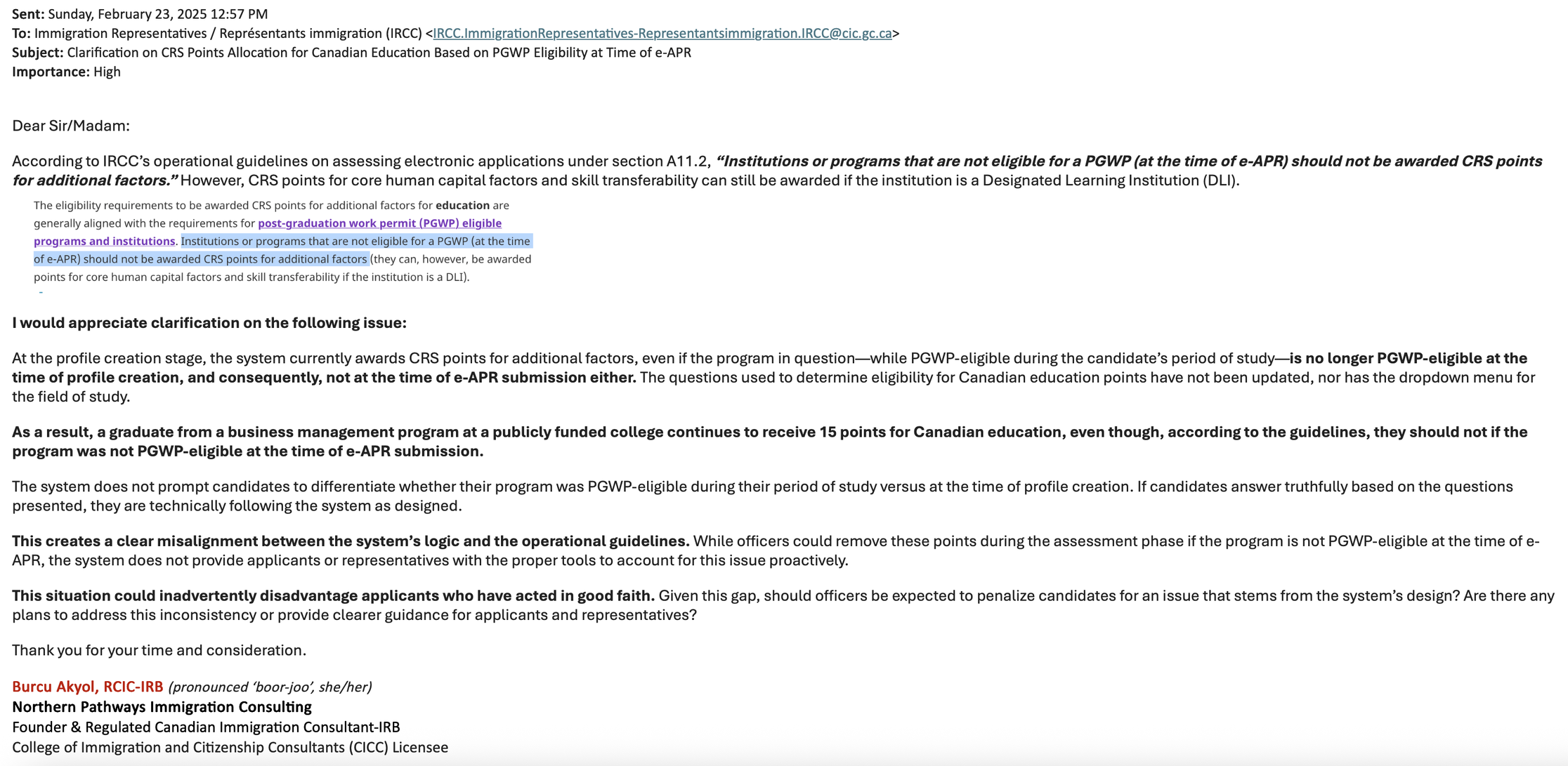In February 2025, I raised this issue with IRCC’s Immigration Representatives mailbox. In April 2025, I received a response. In May 2025, I addressed it in an article under “Issue 3: Confusion Caused by A11.2 Guideline on PGWP Eligibility for Canadian Education Points.”